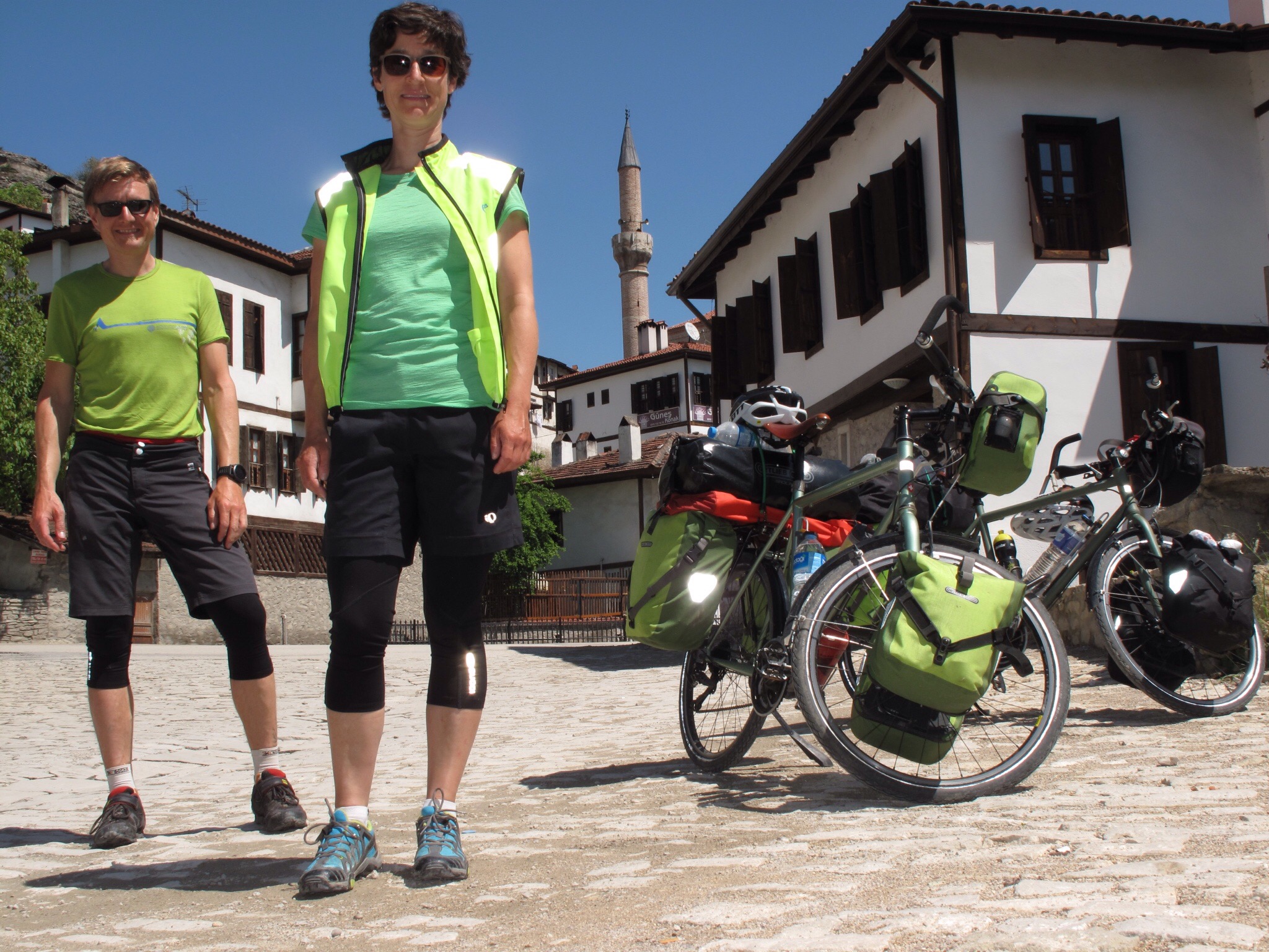 Von Korinthos geht die Strasse über den Kanal von Korinth (sehr eindrücklich) wieder aufs Festland. Und von da an alles der Küste entlang bis nach Athen. Unspektakulär. Zu unserer Überraschung aber, rief uns bei einer Trinkpause jemand unsere Namen zu. Hä, wir kennen doch niemand hier! Um die Ecke kam Vasilis, unser Vermieter in Astakos (5 Tage früher). Er erkannte uns an den Leuchtwesten und dachte, Leute auf dem Fahrrad mit Gepäck, das können nur die crazy Swiss people sein.