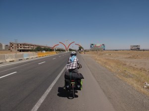 Der Grenzübertritt war dann super einfach. Das Gepäck durch einen Röntgenapparat, wir dann 30min in der Schalterhalle warten und schon hatten wir den Stempel und es durfte weitergeradelt werden. Ach ja, ab nun gelten auch ganz andere Kleidungsvorschriften. Frauen nur mit Kopftuch, langen Ärmeln und langer Hose, Herren ohne Shorts. Wir haben uns schon vorher mit entsprechender Kleidung eingedeckt, damit uns die Hitze nicht gleich erschlägt wenn wir so zugeknöpft umherradeln.