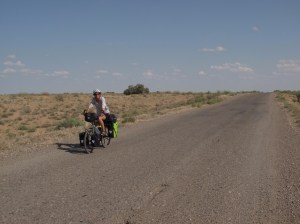Los vom Grenzort Sarakhs gings gerade hoch Richtung Mary. Die nächsten 90km gingen durch eine trockene Steppenlandschaft ohne Möglichkeit irgendwo was zu kaufen. Wir bunkerten so viel Wasser auf unseren Velos wie möglich. Nur die Hitze, der Gegenwind und die schlechte Strasse forderten ihren Tribut. Unser Wasser wurde immer weniger und der Durst immer grösser. Just zur richtigen Zeit kam ein Lastwagen angebraust, hielt an und schenkte uns eine 1,5L Flasche kaltes Mineralwasser. Ein Geschenk des Himmels.
