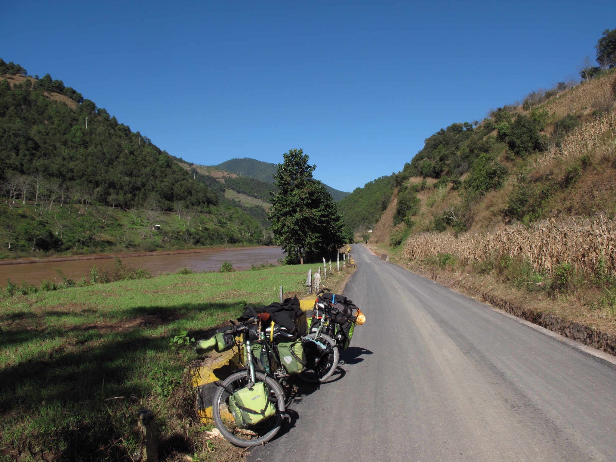 Dem war noch nicht genug. Aufs mal fehlte die Brücke (weggespühlt) und wir mussten Gepäck und Fahrräder einzeln über einen schmalen Steg und schlüpfrigen Terrassenwägli auf die andere Seite tragen. Nässe, Dreck, Schleppen, Schwitzen, das wäre ja alles noch ertragbar wenn dann nicht noch einer das Gleichgewicht verliert. Nur ein kurzer Blick in die falsche Richtung machte mich duselig und ich ladete inkl. Taschen im schlimmsten Reisfeld voller Schlamm. Lustigerweise blieb ich für einmal ganz ruhig. Pädu schüttelte nur den Kopf und konzentrierte sich auf seine Schritte. Mancher der vielen Zuschauer lachte kurz, die Frauen hatten Mitleid und eine deutete mir auf ein Haus etwas weiter der Strasse entlang, es habe da Wasser zum waschen. Ja somit musste ich mich bis auf Radlerhose und BH ausziehen und alles vom Schlamm befreien. Die Arme fühlten sich an wie im Gips. Das war wirklich eine Saubüetz alles wieder rein zu kriegen. Die nassen Sachen wieder angezogen, trocknet alles super schnell in der Sonne. Und diesen Abend fanden wir sogar ein hervorragendes Plätzchen um wiedermal unser Zelt aufzustellen. Perfekt.