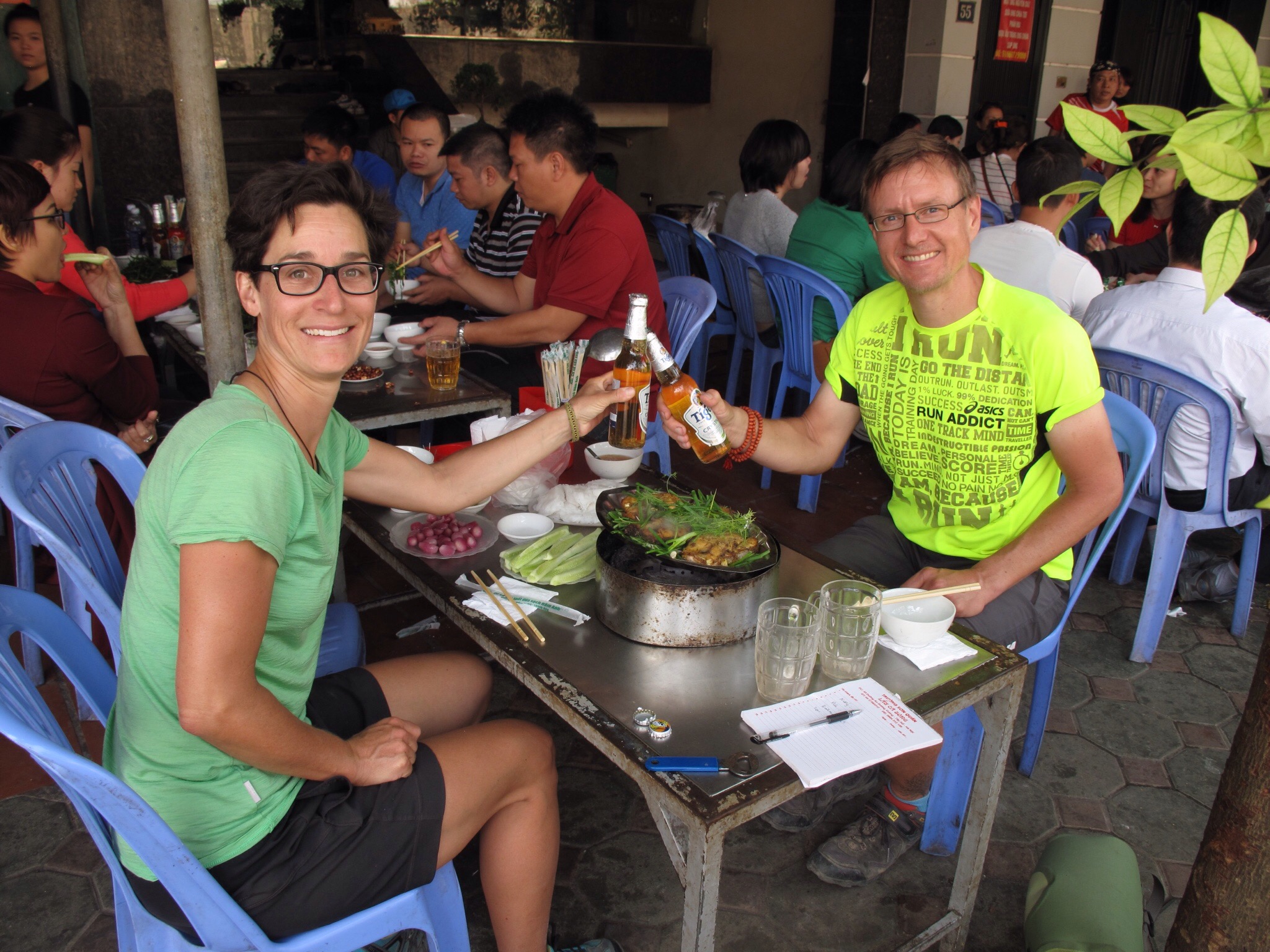 In der Hauptstadt angekommen, quartierten wir uns in einem netten Hotelzimmer ein, mit viel Platz, um die Fahrräder und unser Gepäck zu verpacken. Am nächsten Morgen machte ich mich auf die Suche nach 2 Velokartons und geeigneten Taschen um unsere Sacochen reisetauglich zu verpacken. Dann gings ans verpacken, umpacken, wieder entpacken…. stundenlang. Körndle übte sich in ihrer Geduld, da einarmig keine grosse Mithilfe geleistet werden konnte. Zwischendurch ein Thaicurry zwischen die Zähne (Thailand ist ja nur gleich über den Mekong) und abends ein Bierchen um den Stress etwas zu vergessen.