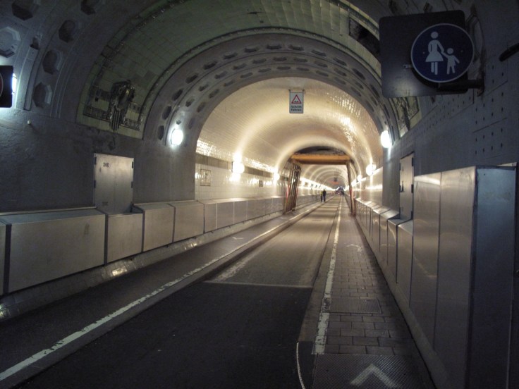 Auf der Weiterfahrt nach Hamburg stellte sich uns die Elbe in den Weg. Zum Glück hatten ein paar Ingenieure aber bereits ähnliche Sorgen und bohrten einen Tunnel unten durch. Was sie aber anscheinend vergassen, waren die Zu- und Wegfahrstrassen. Also mussten an beiden Enden Aufzüge hin. Und voilà, schon hat man den alten Elbtunnel in Hamburg. Nun nicht mehr für Autos geeignet, sind auch alle viel zu breit geworden, dafür aber umso bequemer für Fahrradfahrer und Fussgänger.