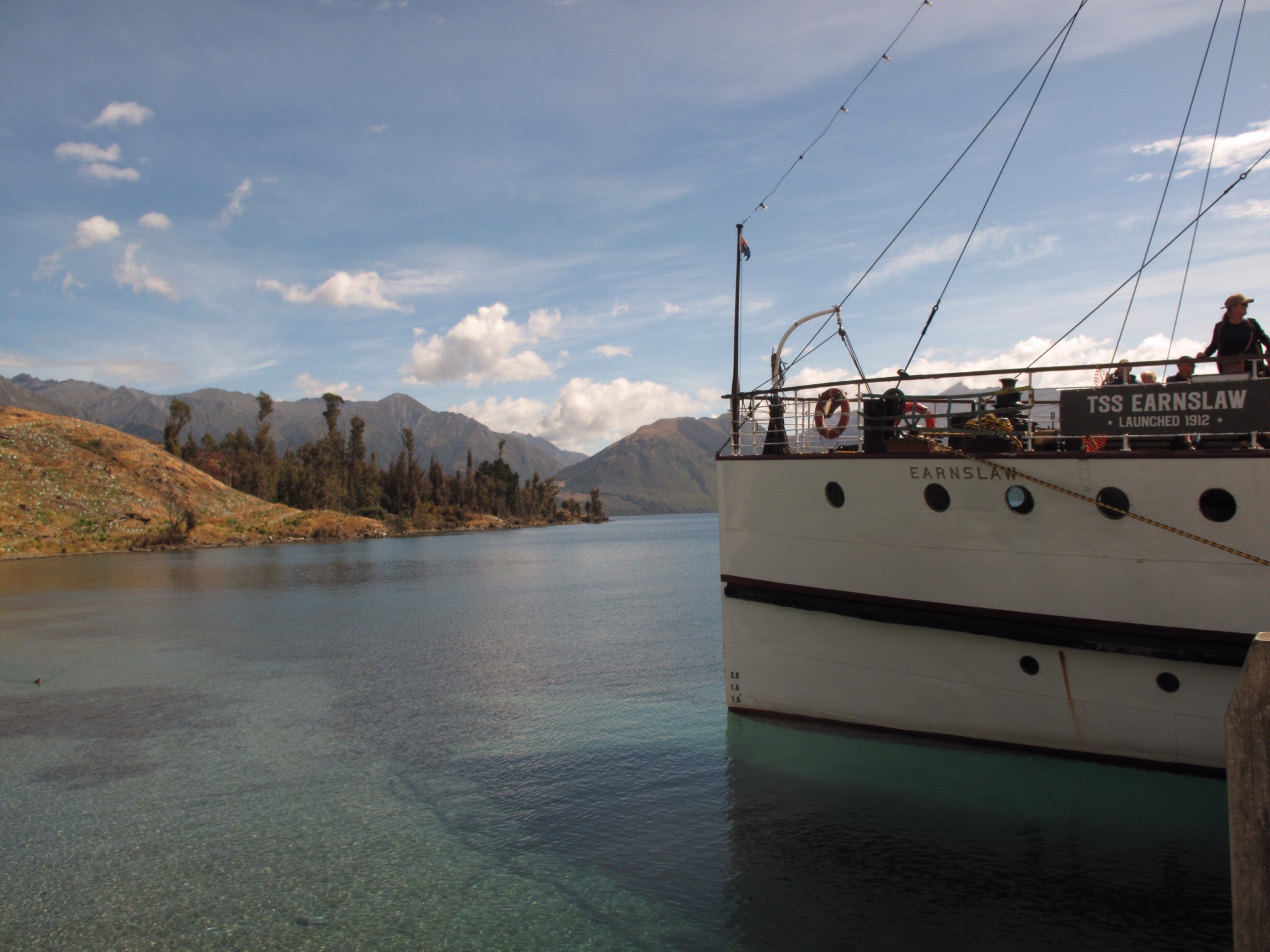 Queenstown war die nächst grössere Ortschaft. Der geplante Ruhetag viel jedoch aus, da alle Hostels ausgebucht waren und ich nur ein Bett für eine Nacht erhielt. Hochsaison halt. Und so querte ich am nächsten Tag den Lake Wakatipu mit einem alten Dampfschiff (TSS Ernslaw, Baujahr 1912) zur Walter Peak Country Farm. Ebenfalls an Bord waren Pet & Clare, zwei radreisende Kanadier aus Quebec. Die nächsten Tage radelten wir gemeinsam durch einmalige Landschaften. Geprägt von sandigem Fels, sanften Hügeln und trockenen Flüssen, könnte Winnetou hinter jeder Kurve auf uns lauern!