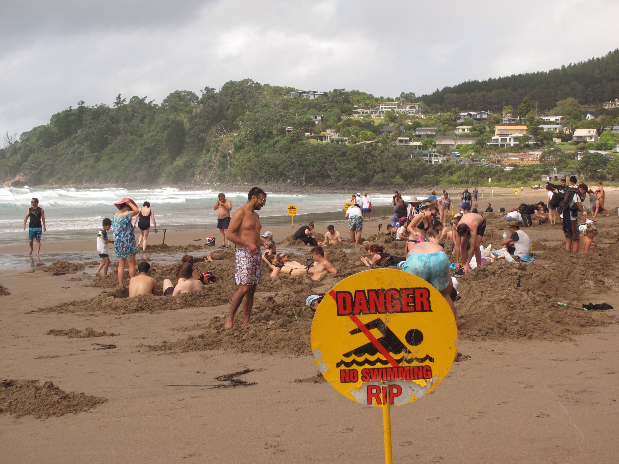 Weiter nördlich liegt der Hot Water Beach. Ein Strandabschnitt, an dem heisses Wasser aus dem Sand kommt. So baden skurilerweise mehr Leute im Sand als im Meer!?