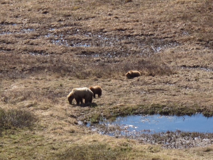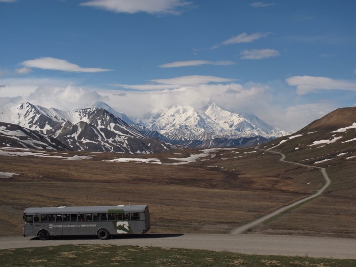 Es war ne pure Freude, auf der nicht asphaltierten Strasse durch die einmalige Landschaft des Denali NP zu radeln. Ein paar Elche schauten neugierig aus dem Gebüsch, diesen lässt man aber in sicherer Distanz genügen Spielraum. Ansonsten begrüssten mich immer wieder mal ein Erdmännchen, ein Hase oder ein Vogel zwitschernd von einem Ast. Nicht mal die offiziellen Tourenbusse und der aufgewirbelte Staub vermochten die Stimmung zu trüben. Bären sah ich nur 3, eine Mutter mit 2 Jungen aus sicherer Distanz von der Strasse.